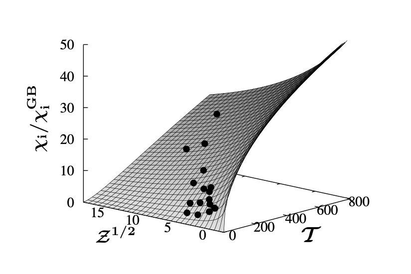 乱流により、高温プラズマは外部へと漏れ出します。対象にもよりますが、近年のスーパーコンピュータの演算能力の向上に伴って、その様子は乱流シミュレーションで正確に追うことができるようになっています。しかし、この数値シミュレーションに必要となる計算機規模は、富岳や不老のようなスーパーコンピュータの大半のシステムを数百時間、利用してようやく達成されるほど巨大な計算量になります。そのため、乱流輸送の定量的な予測を現実的な時間で達成するためには、何かしらの簡約化モデルが必要になります。我々は、これまでに蓄積した乱流シミュレーションの膨大なデータを元に、乱流輸送を再現し得る物理モデルを構築しています。